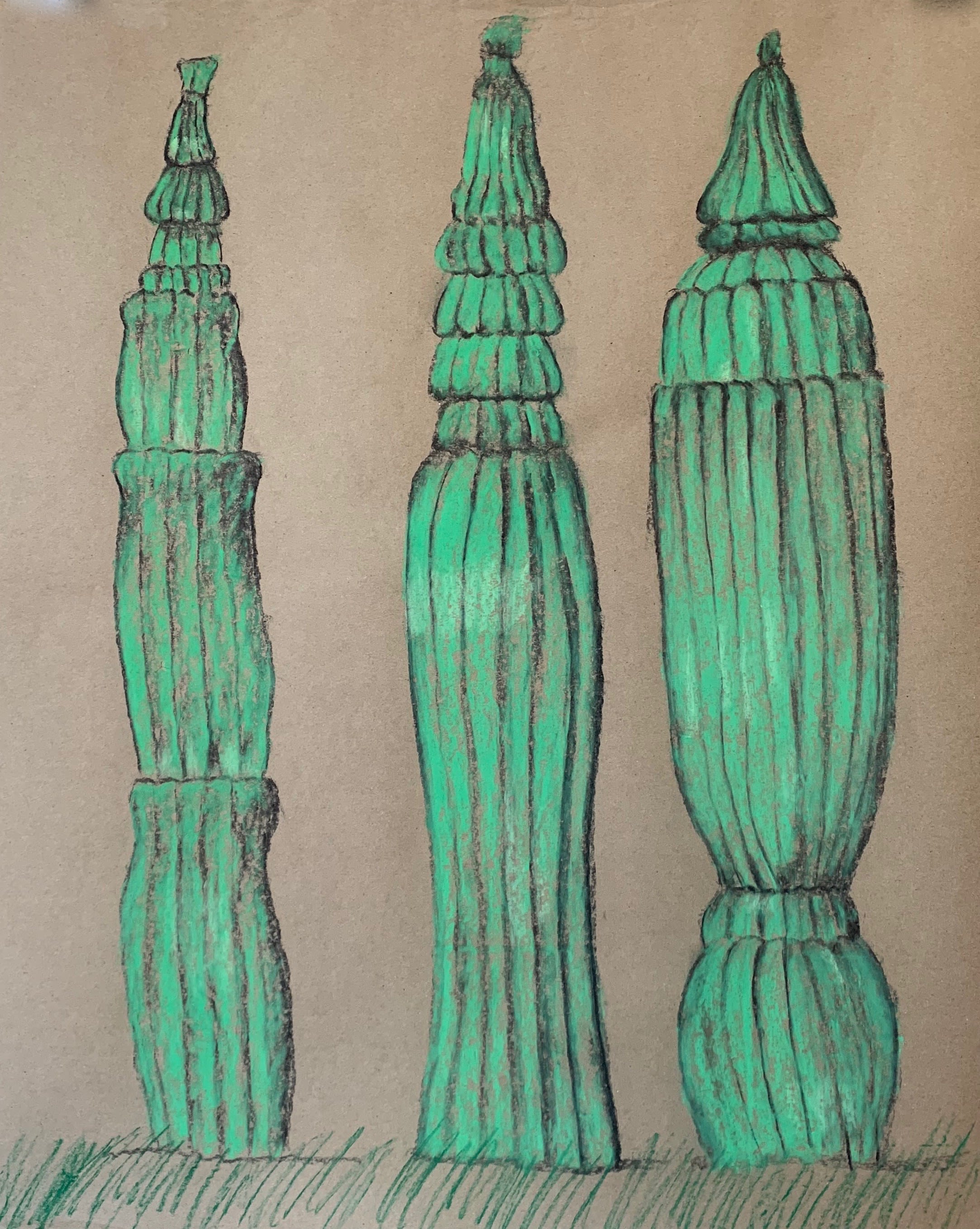 Given their notable height and polished solid-bodiedness, these pieces are apt to strike us, initially at least, as powerfully individualistic forms, remarkable specimens of flora transported from some temporally or spatially distant ecosystem. This, of course, is a habit of human perspective, to think in terms of individuals, whether it is a matter of subjects or objects, observers or specimens. Whether we first assume these intriguing shapes to be prehistoric or extra-terrestrial plants, or perhaps microscopic organisms magnified to formidable proportions, they command something more than a routine scrutiny. In our engagement with the world around us, we have a strong impulse to try and bring what has hitherto eluded us within the ambit of human comprehension and control. Yet sometimes this act of closing the distance may result in proximities that shock, terrify, surprise, or galvanise us. One might recall how Ernst Haeckel’s detailed drawings of sea organisms – most notably, the radiolaria – served not only the purposes of science but impacted upon architectural and decorative design, leaving an imprint upon the human world. The encounter made a change.