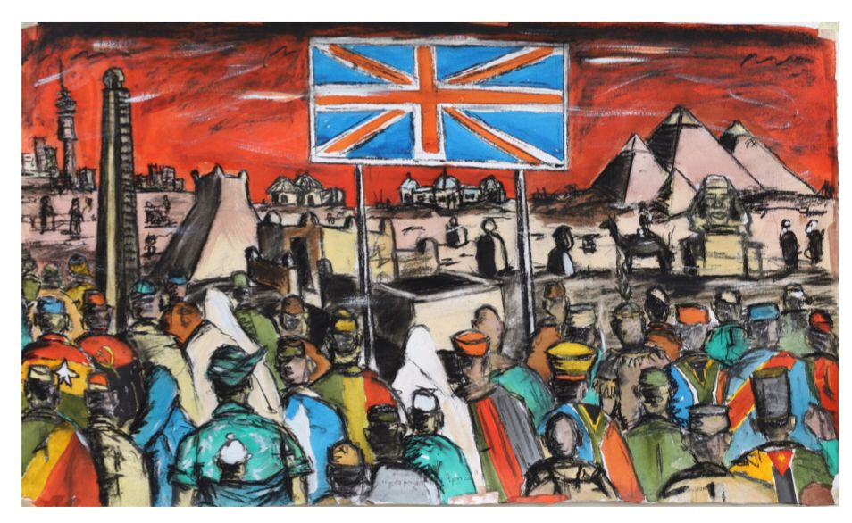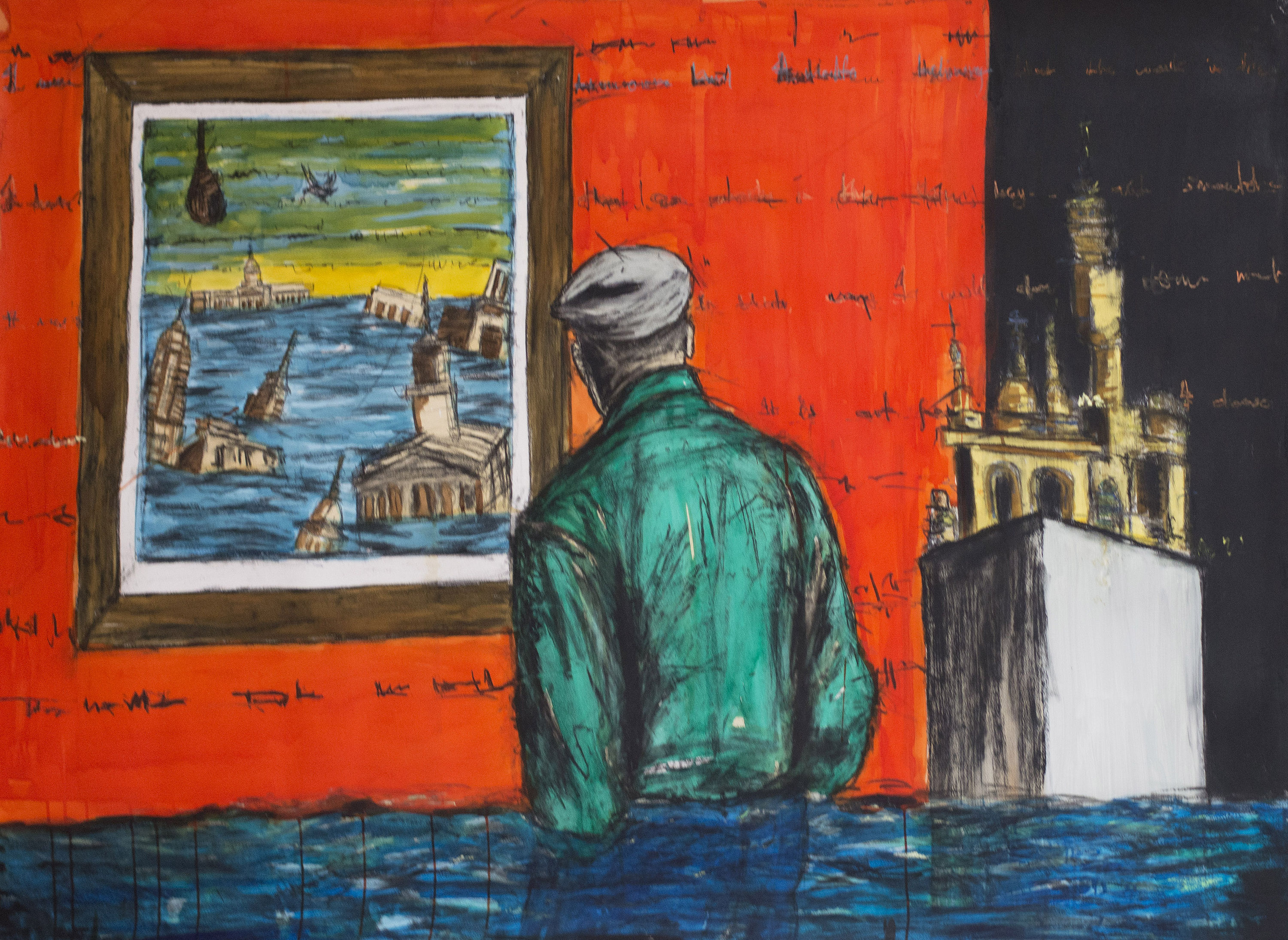 For this work, I drew inspiration from the story of Noah’s ark. In the piece, the floods are taking over the world’s buildings. I depict some monumental buildings from around the world, including the White House. There is a bird at the top of the small artwork being looked at by the figure dominating the larger one. In Noah’s story, when the floods were almost over, he sent out a dove and after seven days it brought back an olive branch — a sign that the storm was almost over and that land would appear soon. That’s me trying to be positive; to say we’re not the first ones to tread water or to be in a situation like this. The storm will be over if we look from the past into the future.