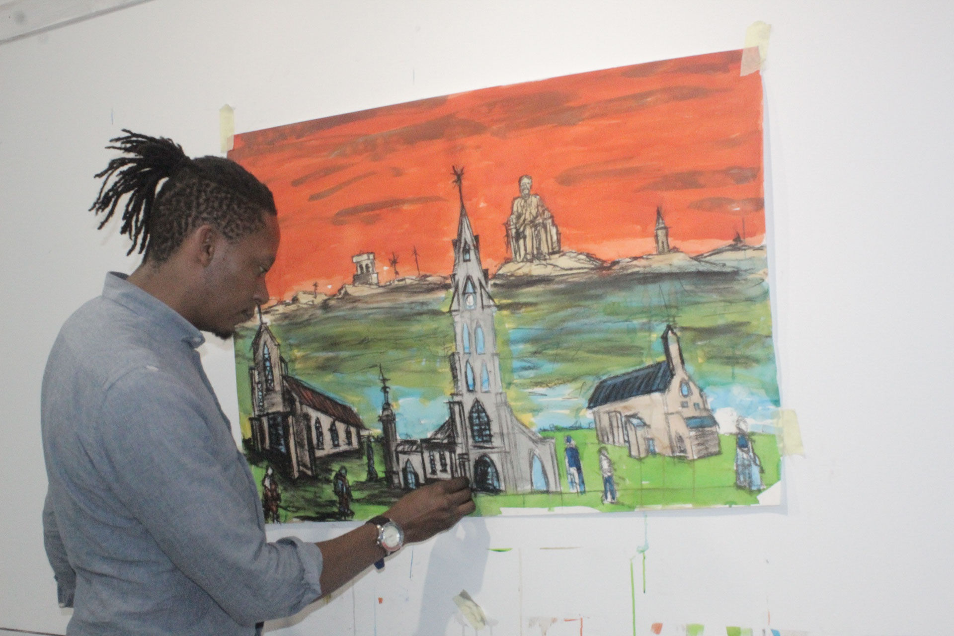 Shabangu says he is drawn to landscape painting because it allows him to tell multiple stories in a single work. The stories he tells range from the autobiographical to things that affect humanity. There is freedom in the artform, and the artist can ask many questions. Another form of inspiration for him desiring to depict places, particularly Johannesburg, is his late father who was a construction worker. On trips to the city, his father would point to all the buildings he had helped construct. What bothers Shabangu is that when he retired after serving for several years, his father did not own a home in the city. His rural home was nowhere near as beautiful and secure as the facilities he had toiled on for all his working years in the city. It is heart-breaking. In art, the son has found a way to tell these stories.