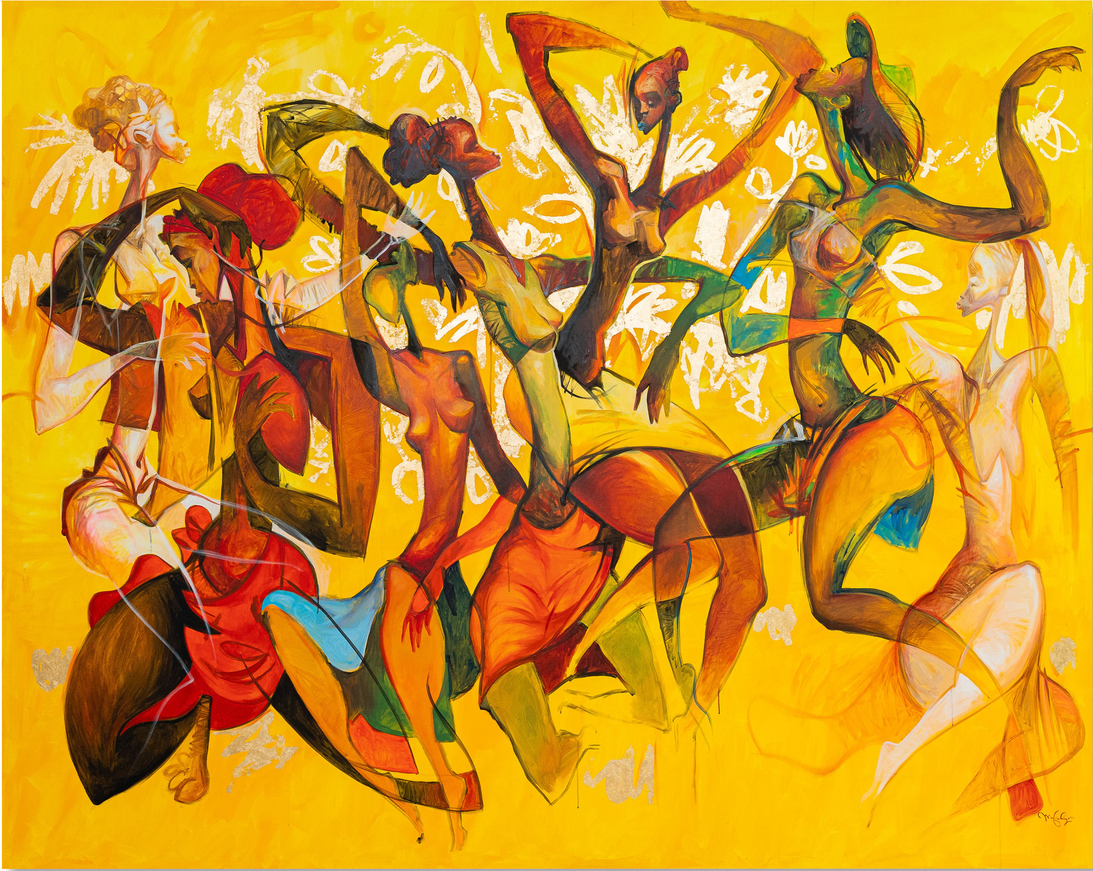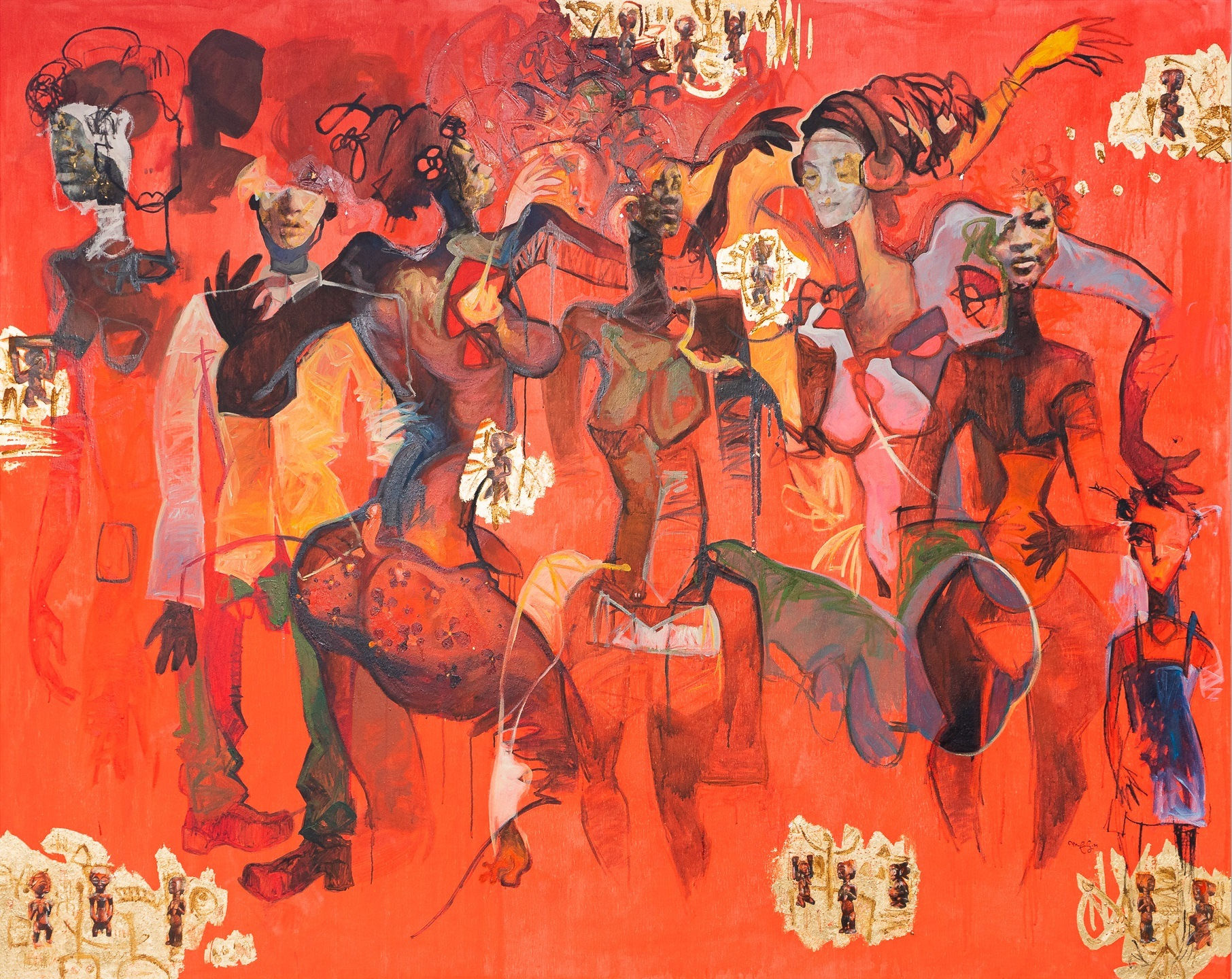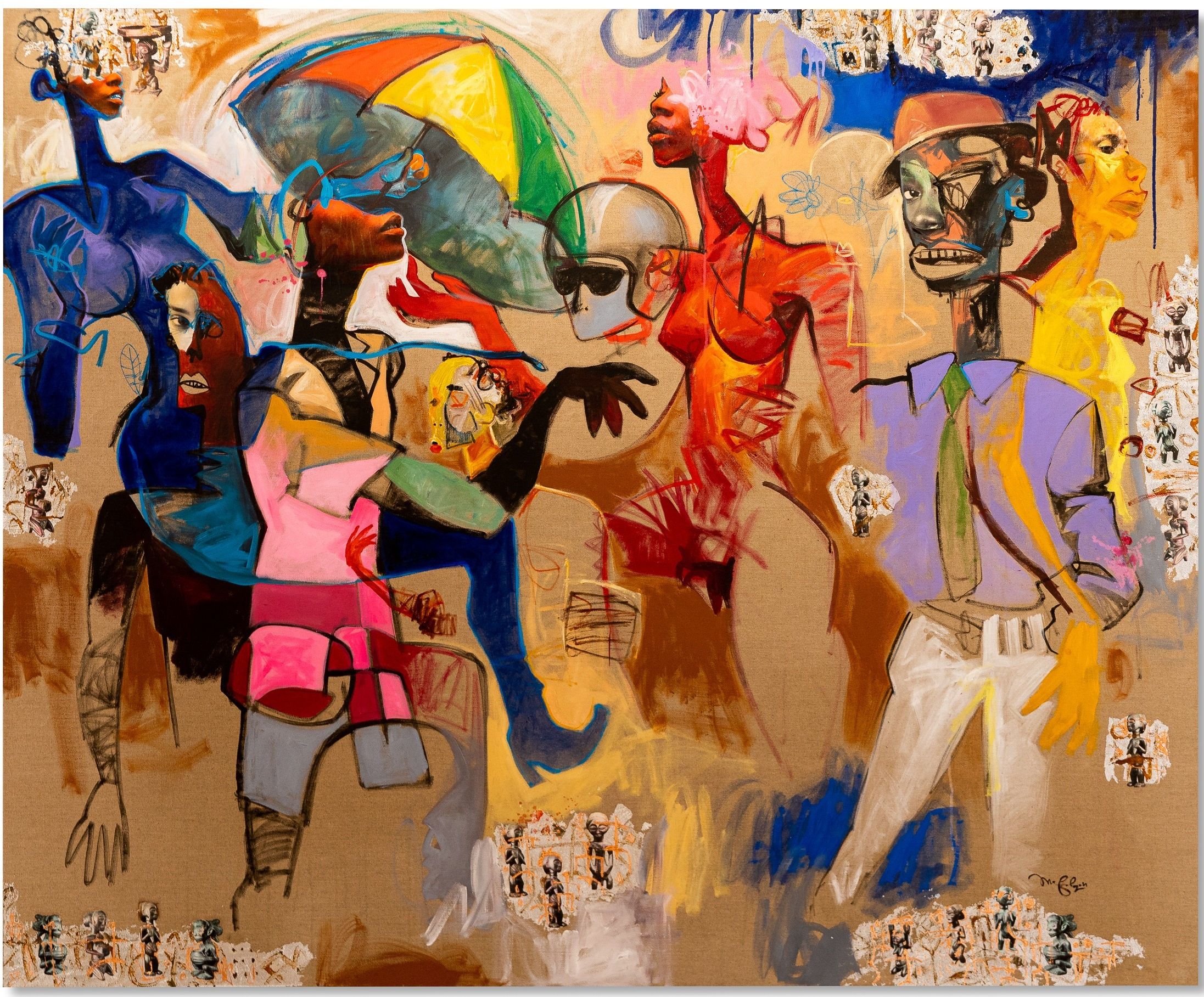 This new body of work, created in 2021, continues to explore the realities of an African culture fragmented by foreign hegemony via figures half human and half animal dancing across his canvases.
