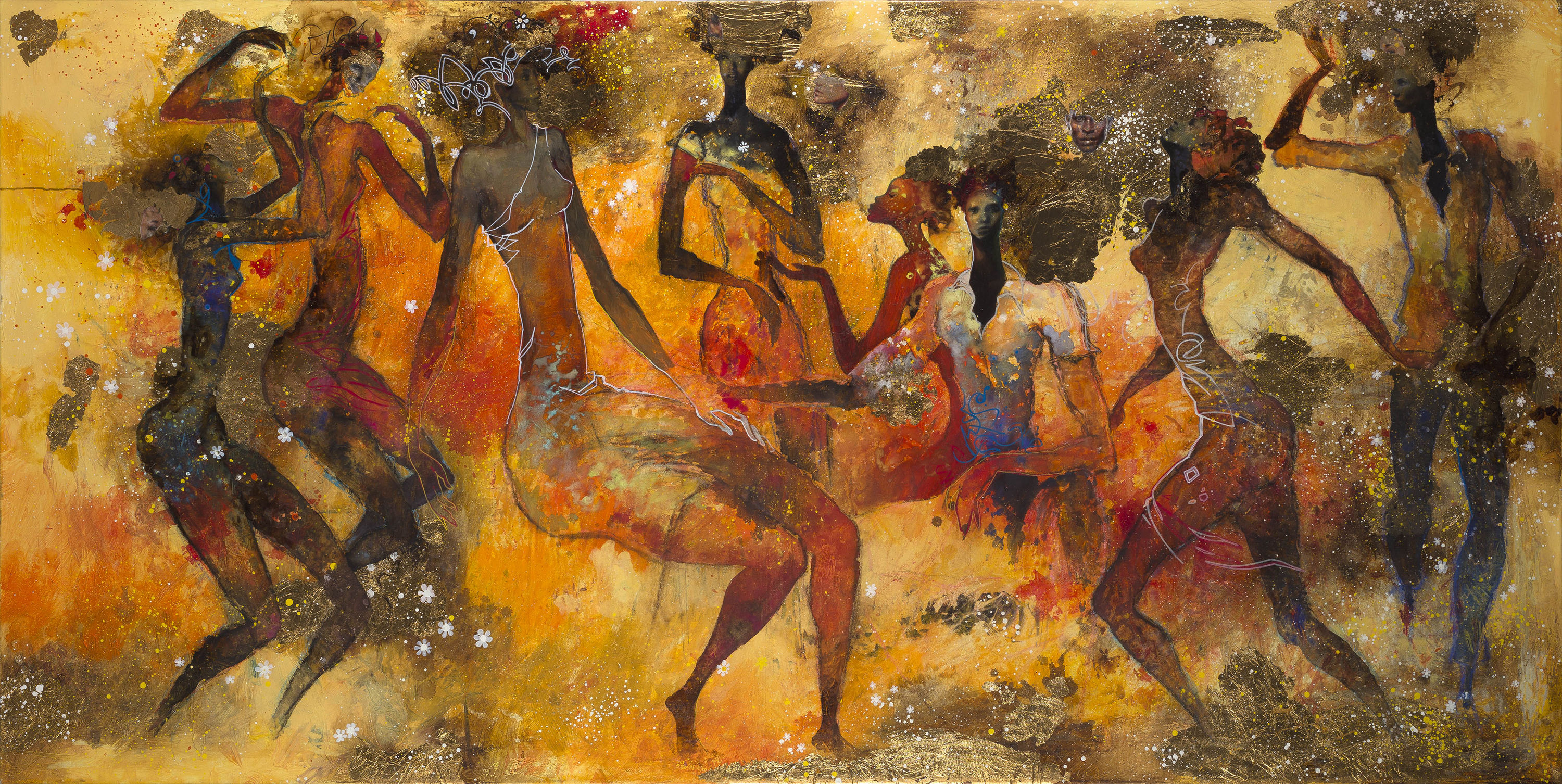 I use gold leaf in my paintings to evoke the special being to gifts that we all possess. But also to celebrate when the black man is at one with his culture and his spirituality. I believe that we discover our true potential throughout our lives and build ourselves like a puzzle, borrowing here and there from others and our experiences.
