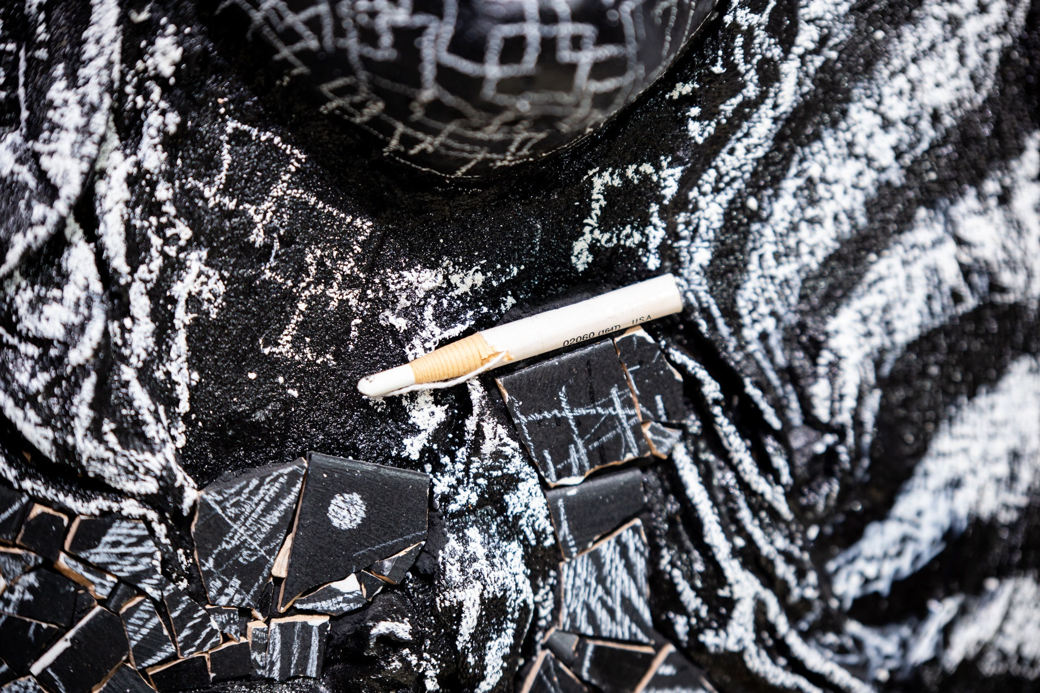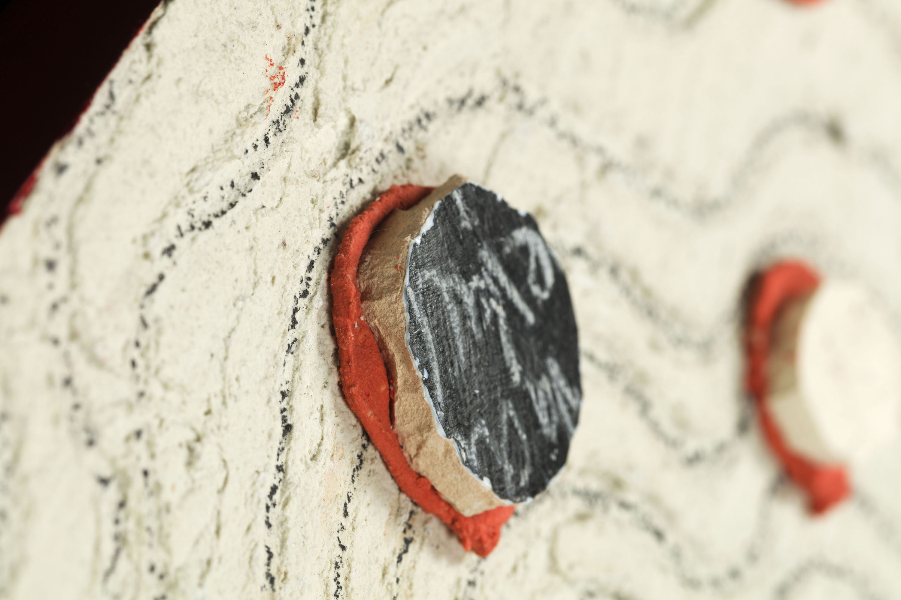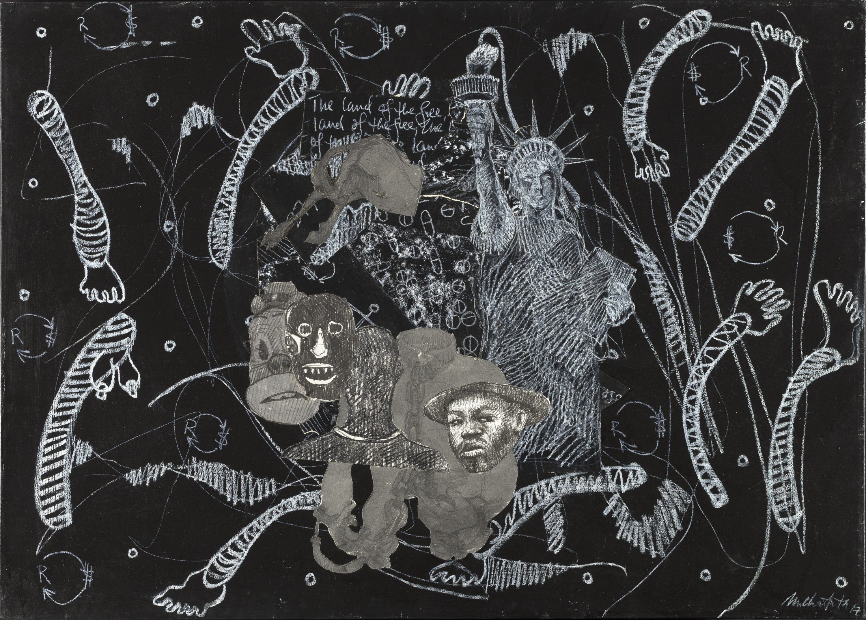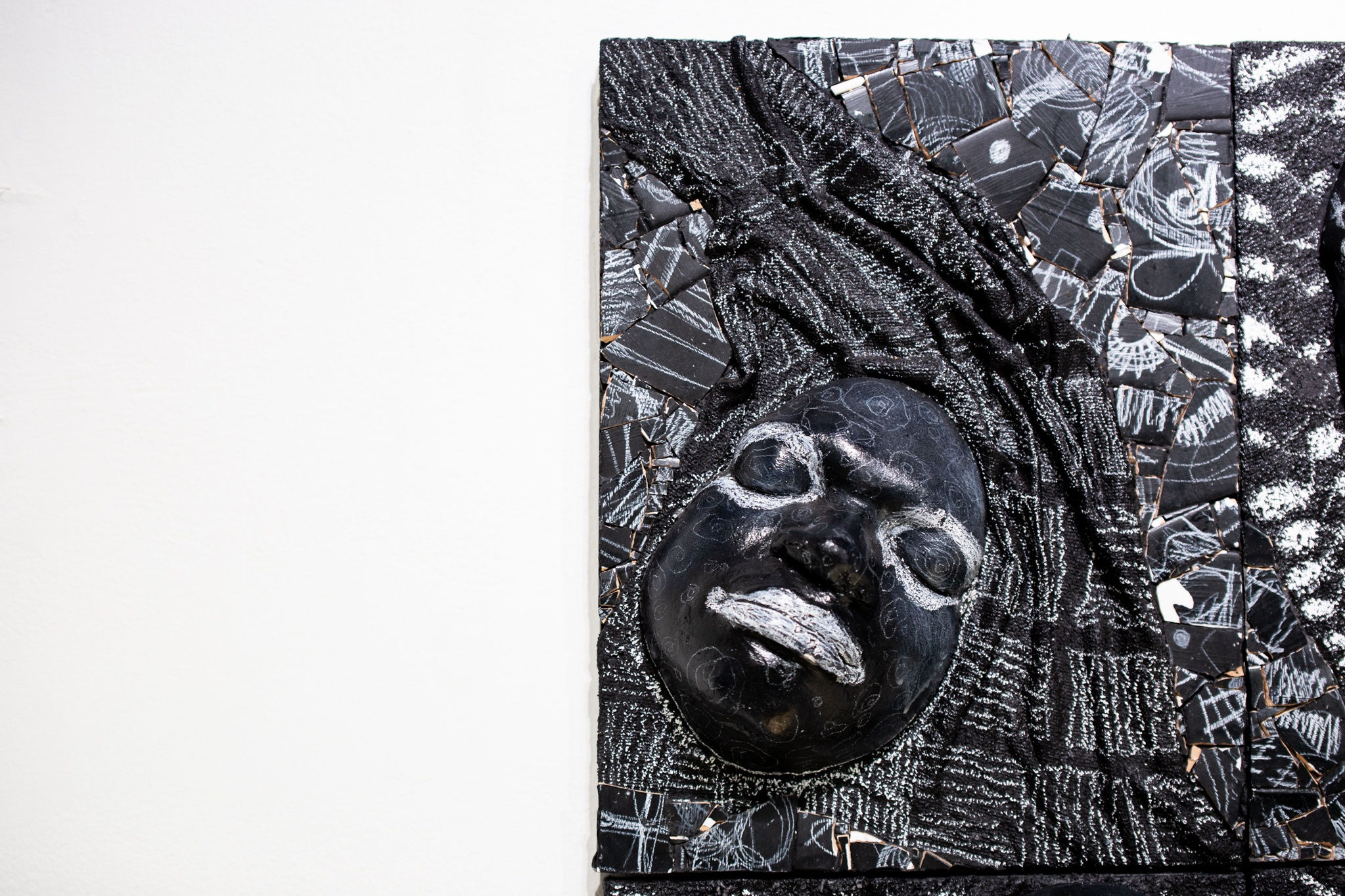 Ronald Muchatuta was born in Zimbabwe, but like many of his countrymen, he had to take the decision to leave his home and currently lives in Cape Town, South Africa. He uses drawing, paint, collage, and mosaic to examine the effect of leaving one’s homeland physically, spiritually, and psychologically. His work is fraught and harrowing – like a people’s collective nervous breakdown translated onto a canvas. These foreboding themes come from Ronald’s own context: the contemporary issues facing the people of Southern Africa – migration, identity politics, post-colonialism, and discrimination.
