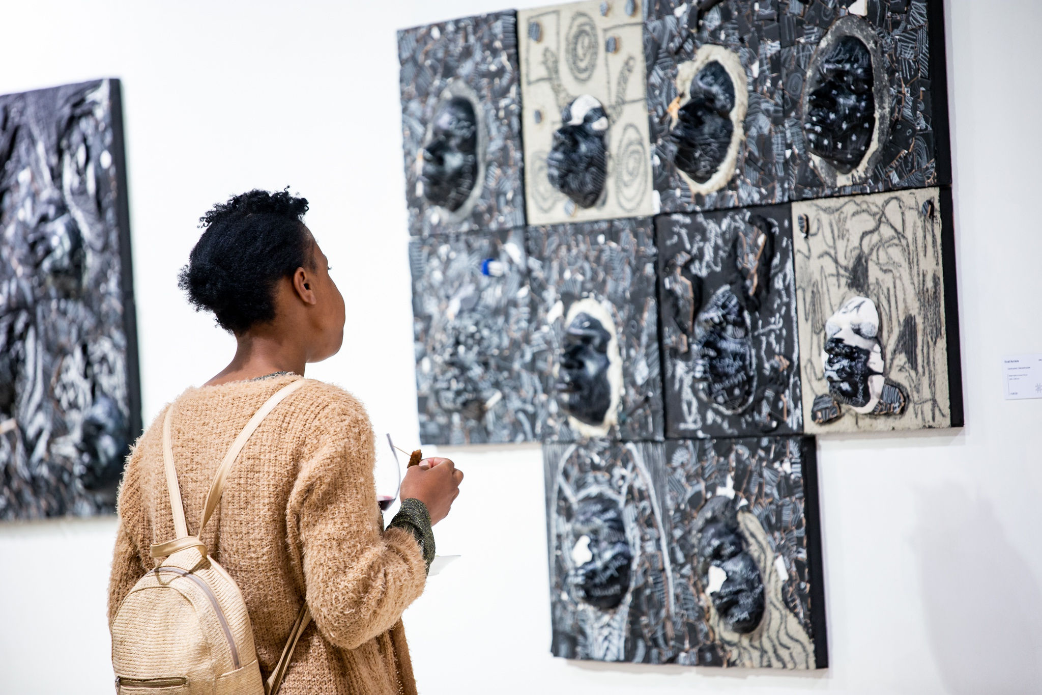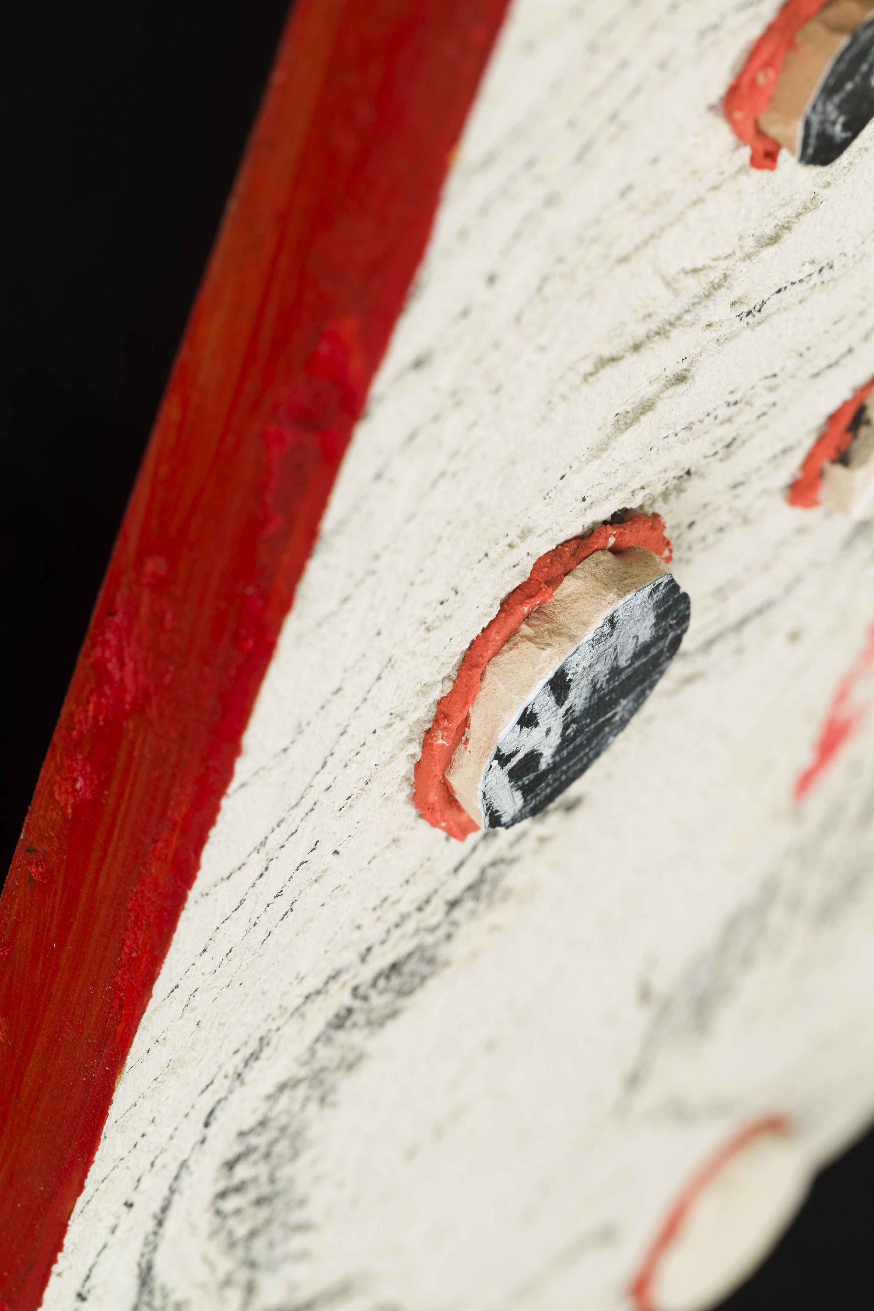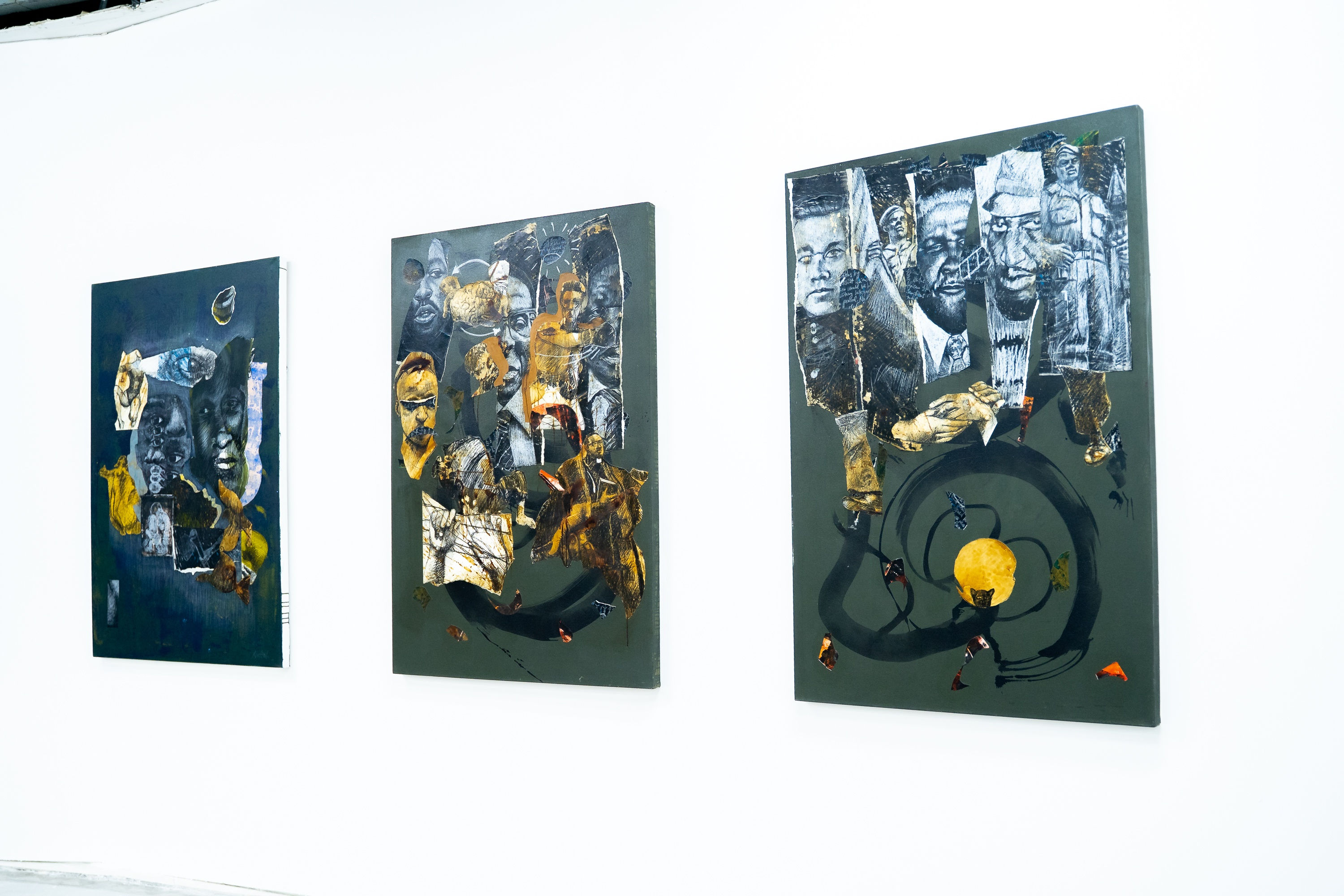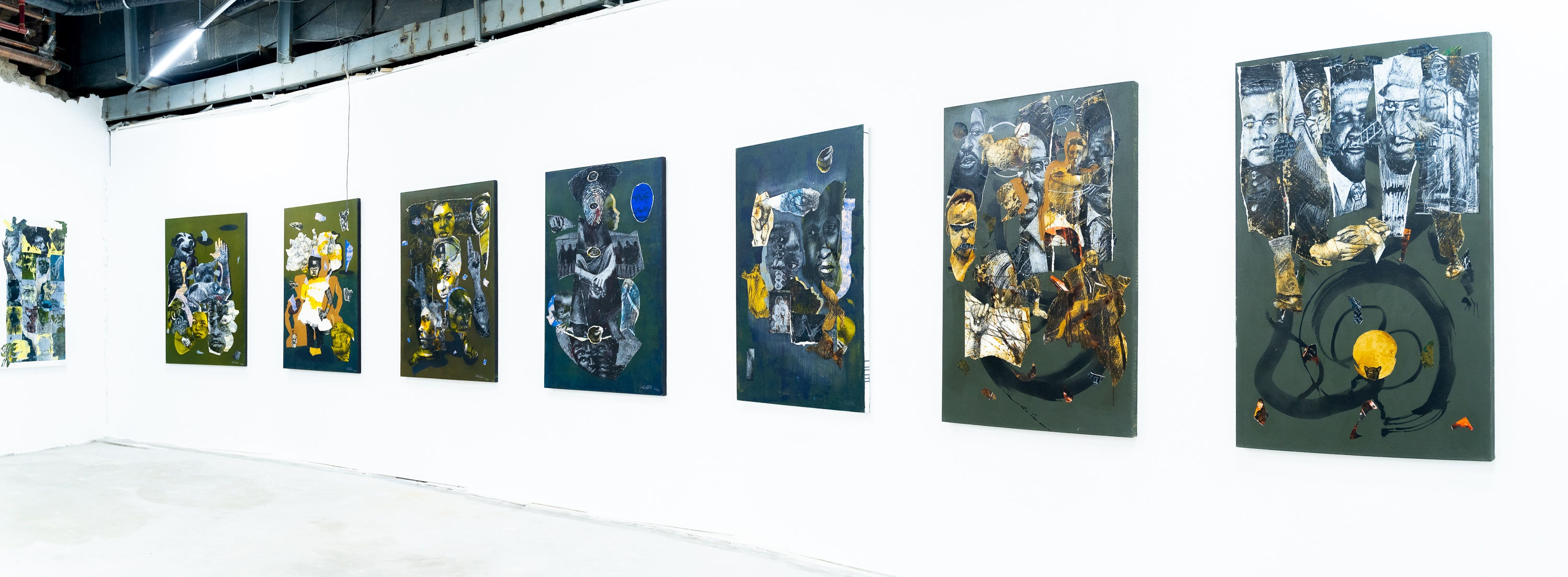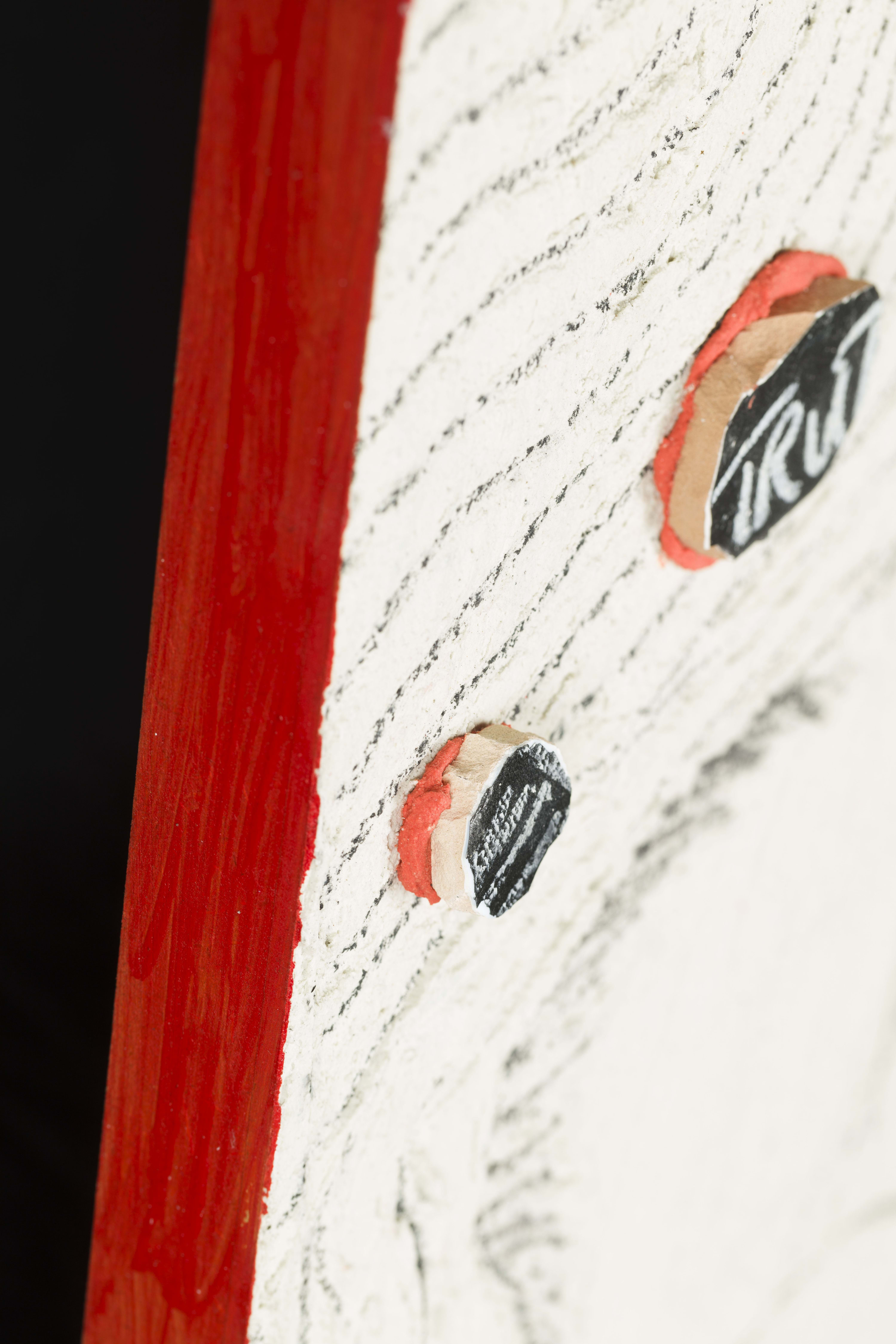 Ronald Muchatuta was born in Zimbabwe, but like many of his countrymen, he had to take the decision to leave his home and currently lives in Cape Town, South Africa. He uses drawing, paint, collage, and mosaic to examine the effect of leaving one’s homeland physically, spiritually, and psychologically. His work is fraught and harrowing – like a people’s collective nervous breakdown translated onto a canvas. These foreboding themes come from Ronald’s own context: the contemporary issues facing the people of Southern Africa – migration, identity politics, post-colonialism, and discrimination.