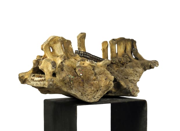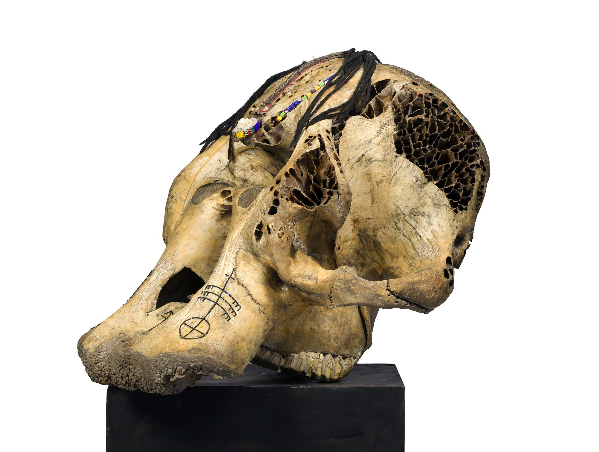 Pitika Ntuli identifies as an artist, academic polymath, political activist, struggle stalwart, poet, and spiritual healer – someone who embraces both the physical and spiritual aspects of humanity. In this body of 45 works, he has engaged in numerous collaborations with other thought-leaders in the arts, music, theatre, literature, politics, media, and performance. One gains a new-found understanding of oneself in a community of things, ideas, people, rituals, and languages. We can see this today, especially in this paradigm of COVID-19, Black Lives Matter, the internet, communication, and knowledge. We see his sculptural acts of divination to bind the spirit animal to the animal bone. We can see an act that aligns itself to the particular moment of a community that gathers around the interpretations of being. We consider what it is that they see or do not see: a community that grows around a concept. Thus, his works reverberate moments that have existed, currently exist, and shall come to exist. In other words, he collapses time through the act of activating the spirit of the bones by decorating them with symbols, beads, shells, objects, and hair which are relevant to the spirit of the bone that he wishes to call upon. Ntuli reconciles the chasm between the two - bone and spirit - by creating a space for the spirit of the animal to come into being. When communicated or brought to us, this spirit ceases to adhere to time but ties itself to the earthly plane that facilitates communication and allows us to draw from their qualities.