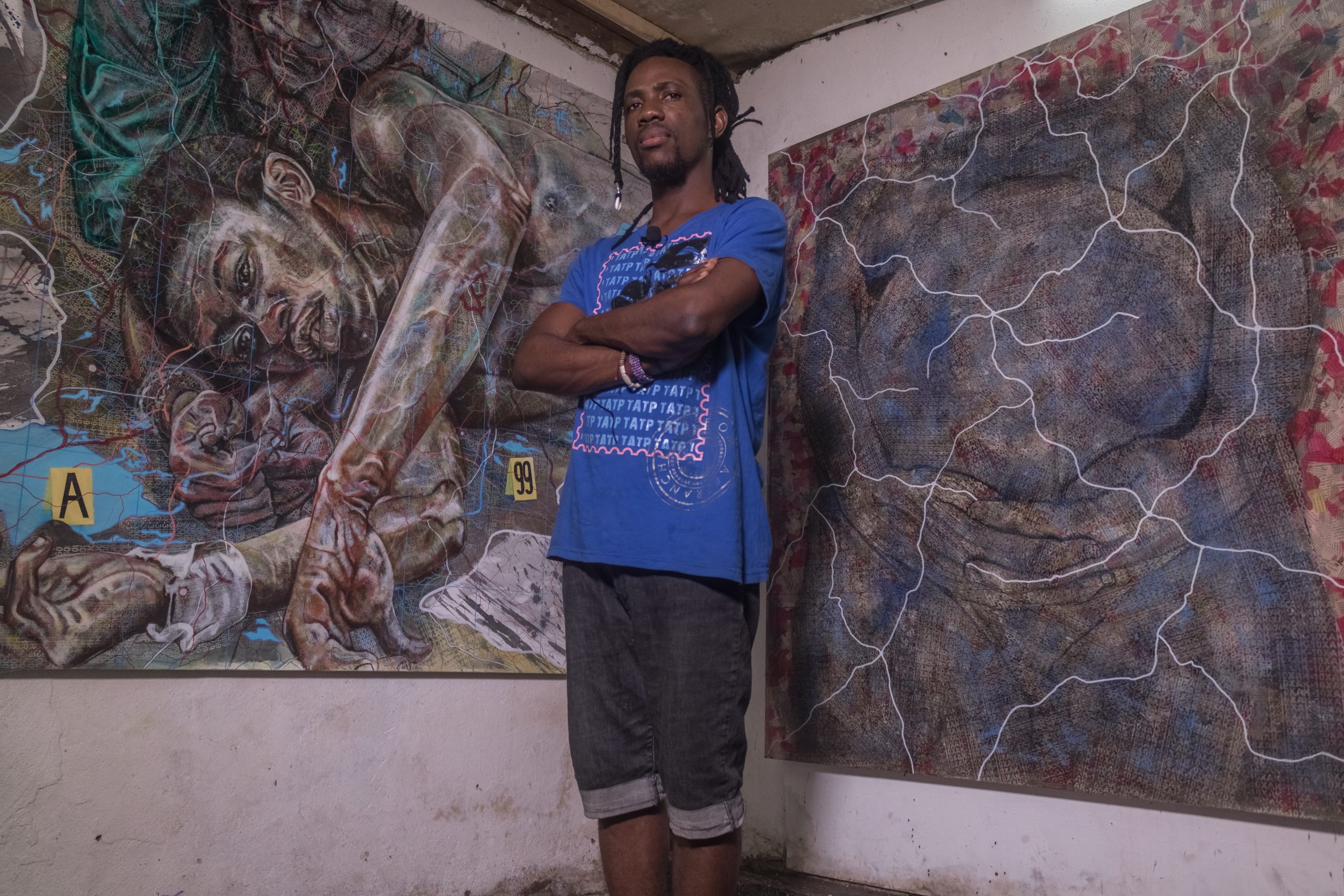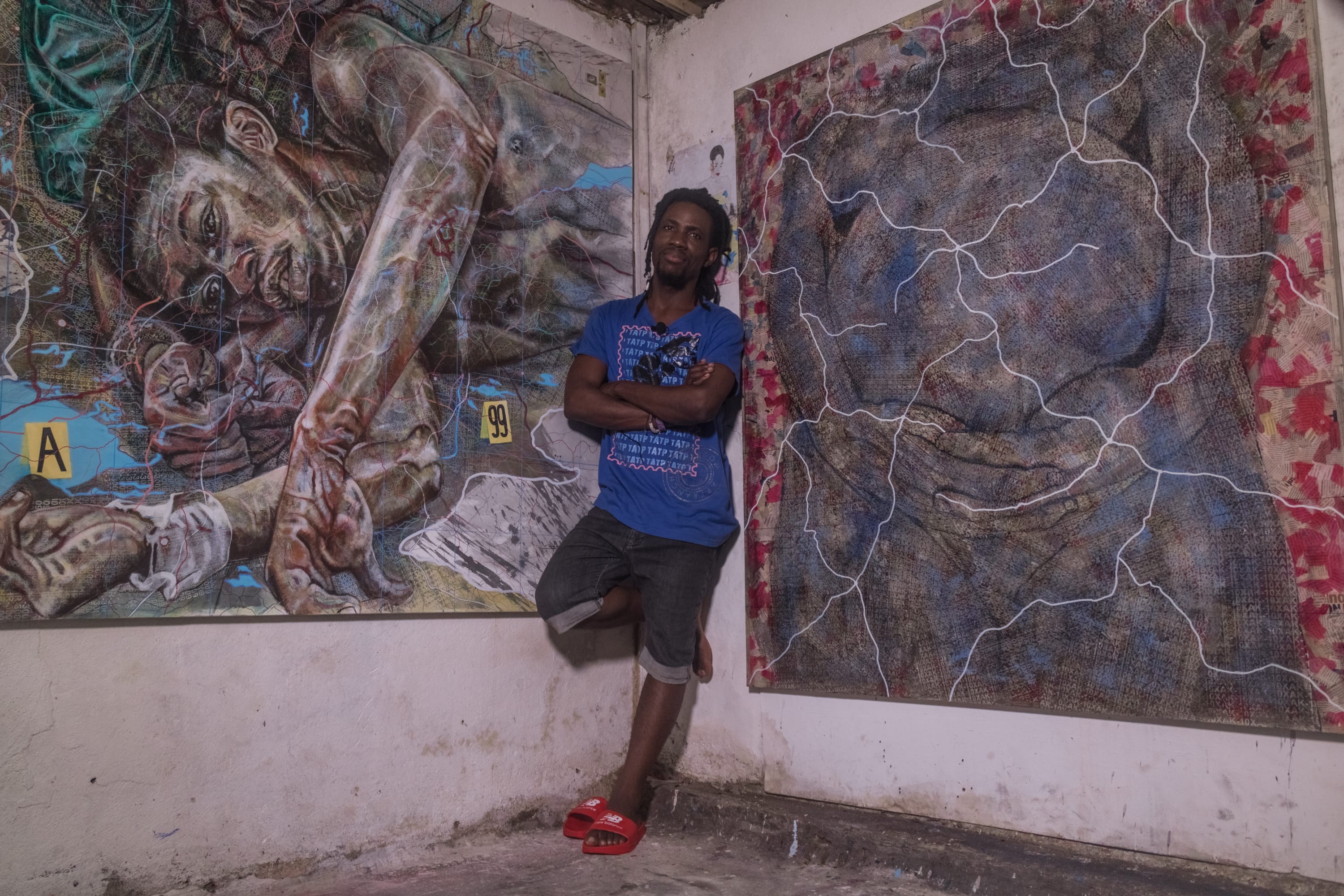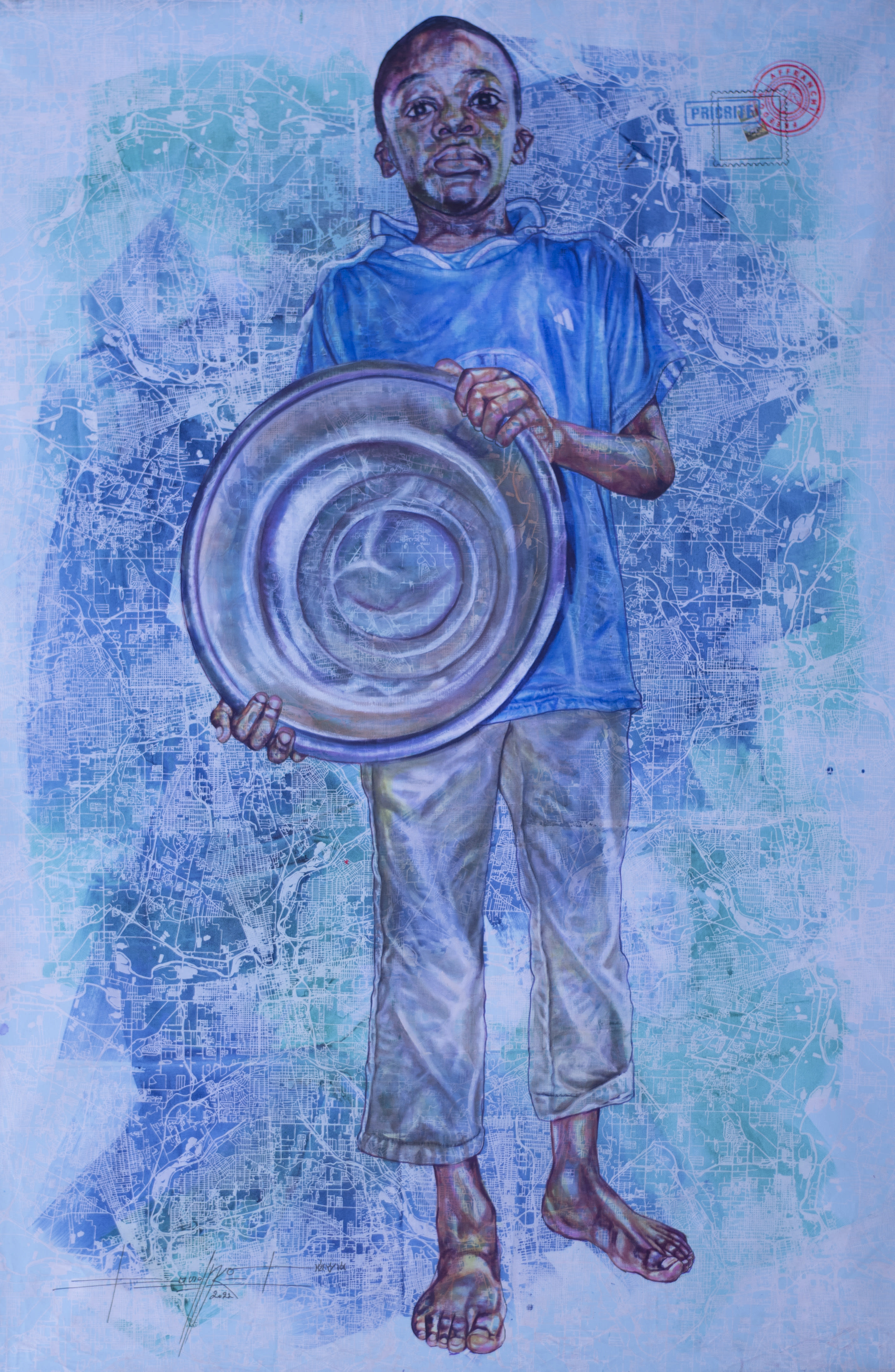 Born in 1989 in Douala, Cameroon, where he lives and works Jean David Nkot is a Cameroonian artist whose work has been exhibited in London, New York, Berlin, France and Yaounde. After painting for his A-levels at the Institute of Artistic Training of Mbalmayo (IFA), he joined the Institute of Fine Arts Foumban where he obtained a degree in drawing and painting. Throughout his training in the fine arts of Foumban, he received several artist distinctions (Best sculptor, installer and painter). In 2017, he joined the « Post-Master » Moving Frontiers, organised by the National School of Arts of Paris-Cergy (France), on the theme of borders. Conscious of what his elders can bring him, he is frequently in the workshops of Hervé Youmbi, Salifou Lindou, Jean Jacques Kanté, Pascal Kenfack and Ruth Belinga.Concerned with the human condition, Nkot works with layers to build up meaning in his mixed-media paintings, telling the story of the subject depicted as well as the wider narrative of the place in which they live – although sometimes, out of necessity, he allows a native of one country to take on and “tell” the story of another. Nkot also explores the mismanagement of raw materials and the mining industry in Africa, Nkot seeks to show the strength and resilience of the people he portrays, not just their suffering.Mercedes Rosés highlights how Nkot creates what he calls ‘molecule maps,’ where he superimposes maps from their surroundings and keywords onto the human subjects. He states that his inspiration comes from artist Thomas Hirschhorn, “Like him, I circle keywords and link them together. I call them ‘maps molécules’ because their structure reminds me of molecules and atoms. By creating a network of data, with information gravitating around a central word, I want to show that they are all connected, that no simple notion stands alone, and that one seemingly straightforward issue can pave the way for a broader debate. At first sight, this mass of information can seem incoherent, senseless – only to reveal the hidden complexity that lies behind it.” -