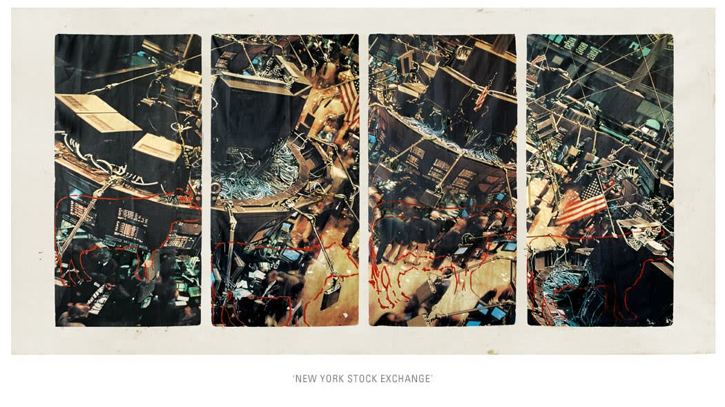 The original installation of fourteen panels on cloth, each measuring 2x1m, were suspended from an intricate aluminium wire system. The series of works recollects the image of a row of flags outside an international symposium venue. In this case it is the New York Stock Exchange.